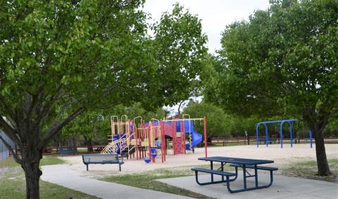 Mike Chappell Park includes a covered shelter with picnic tables and a grill, conveniently located next to the newly installed playgrounds and nearby restrooms — making it an ideal spot for family outings, casual lunches, or an afternoon break outdoors.